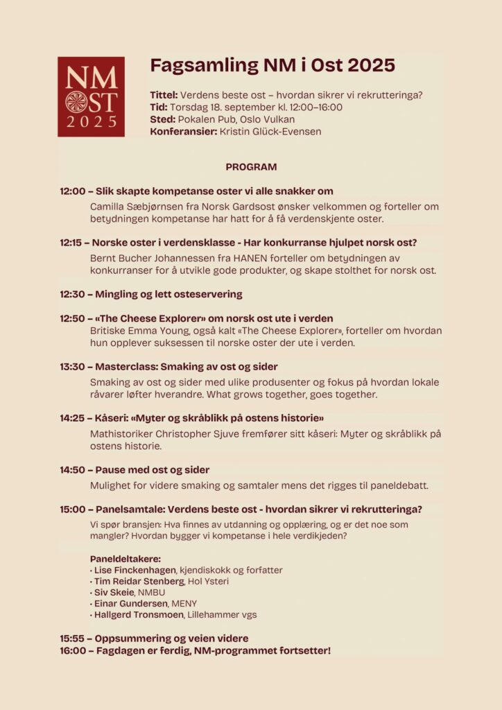 Velkommen til fagdag 18.september der vi samler alle interesserte til en flott dag med spennende foredragsholdere fra 12-16. Det blir ostebonanza, masterclass sider & ost, kjendiskokken Lise Finckenhagen kommer, og mathistoriker Christoffer Sjuve skal dele sine begeistringer for norsk ost. Vi får til og med besøk fra “The cheese explorer” Emma Young, som holder til i England, og har skrevet boken “The Cheese wheel” Dette er en flott arena for å møte bransjefolk innenfor mat og landbruk.Kjøp billetter i dag: Program — NM i Ost 2025
