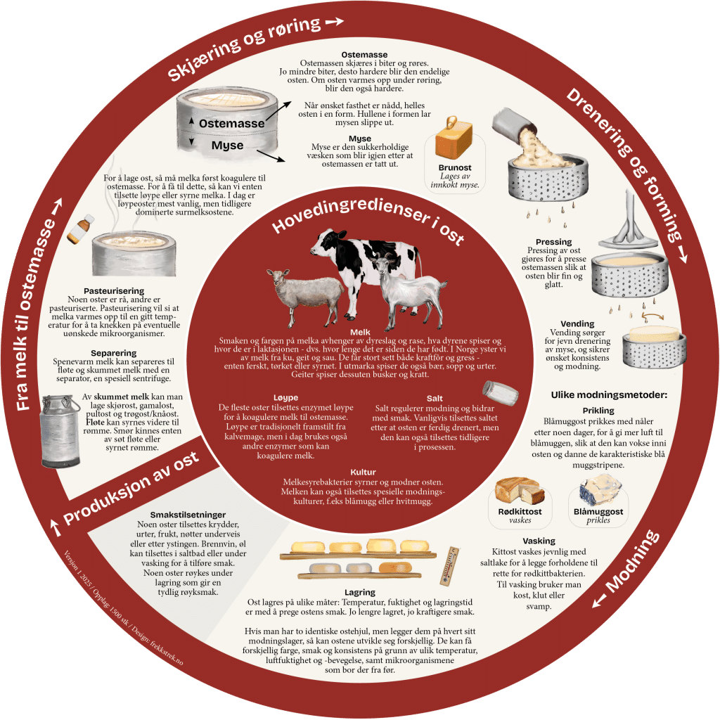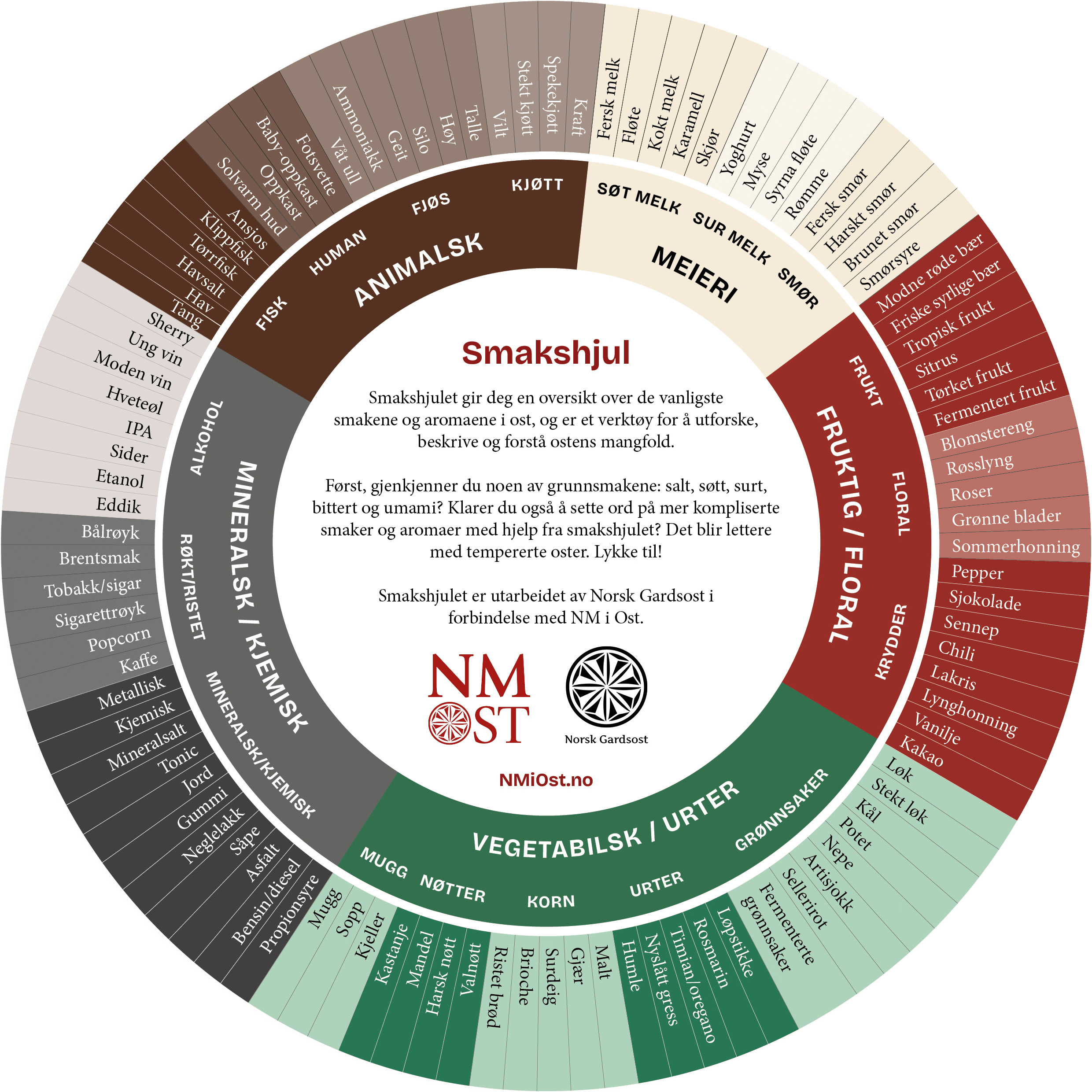 Smakshjulet til Norsk Gardsost er utviklet av dyktige ystere og osteselgere som vet hva ost kan smake. Oversikten beskriver smaker og aromaer som kan finnes i ulike typer oster. Smakshjulet kan du bruke når du skal smake på ost, for å finne ut hva du egentlig smaker og lukter. Start innerst og gå utover. Det er mulig å bestille fysiske smakshjul gratis som medlem av Norsk Gardsost. Hvis du ikke er medlem kan du bestille antallet du ønsker i Butikken